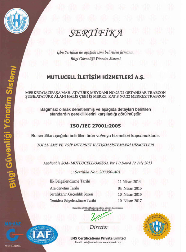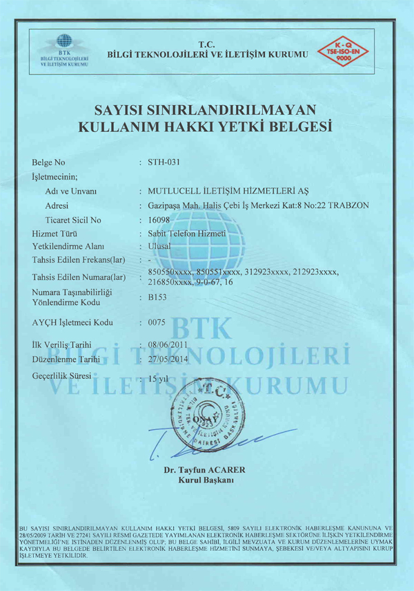 Sabit Telefon Hizmeti (STH), Sanal Mobil Şebeke Hizmeti (SMŞH) ve ISO-27001 Bilgi güvenliği sertifikalarımız;